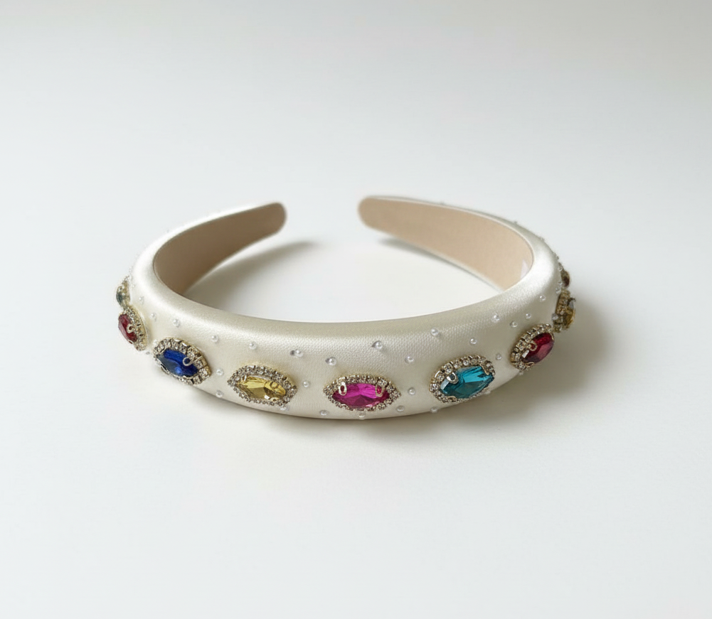 The Aurora Jewel Satin Headband is handcrafted in the UK using a softly padded satin-wrapped base, adorned with oval-cut multicolour crystal stones framed in delicate gold-tone settings.