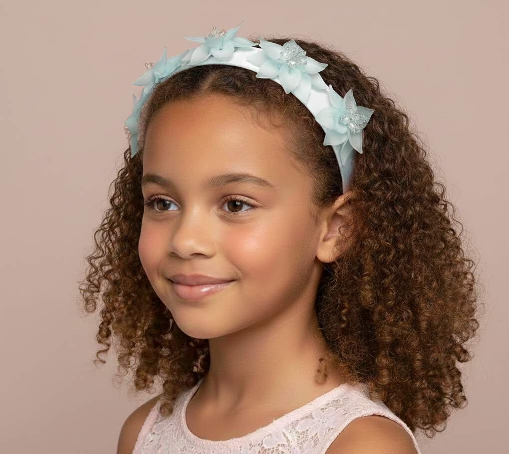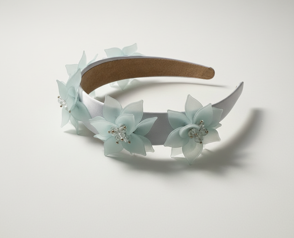 Set on a padded satin-wrapped band, this headband is designed to sit securely and comfortably while maintaining its elegant shape. Available in Mint Bloom and Blush Bloom, it is perfect for special occasions, celebrations, and statement styling.
