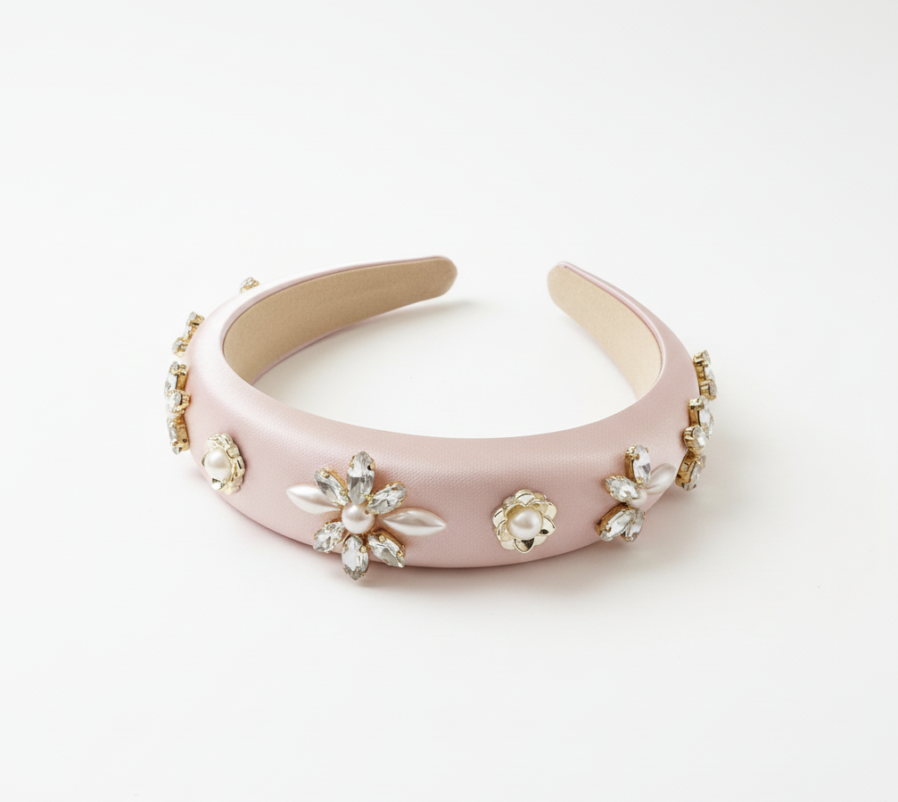 The Champagne Pearl Petal Satin Headband is handcrafted in the UK using a softly padded satin-wrapped base, finished with pearl petal florals and crystal accents arranged in a balanced, elegant pattern.