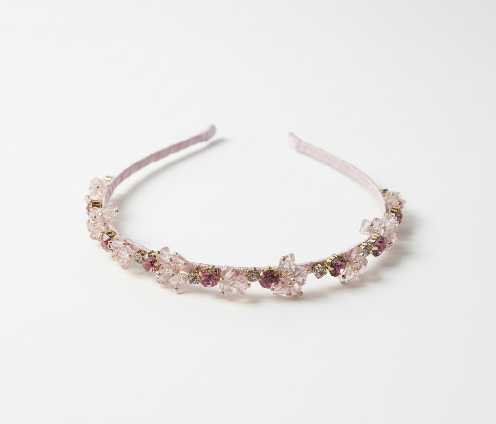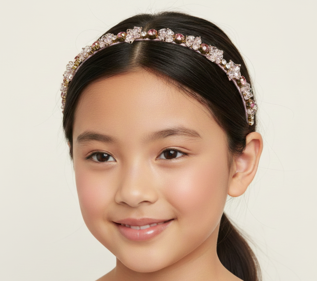 The Crystal Garden Headband is a refined statement piece designed for special moments. Crafted on a slim, satin-wrapped band, this headband features delicately arranged crystal clusters inspired by floral petals, creating a soft yet luxurious sparkle. The lightweight design ensures comfort, while the elegant crystal placement delivers a couture finish without overwhelming little heads. Available in four classic colourways, this piece transitions effortlessly from weddings to birthdays and everything in between