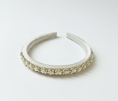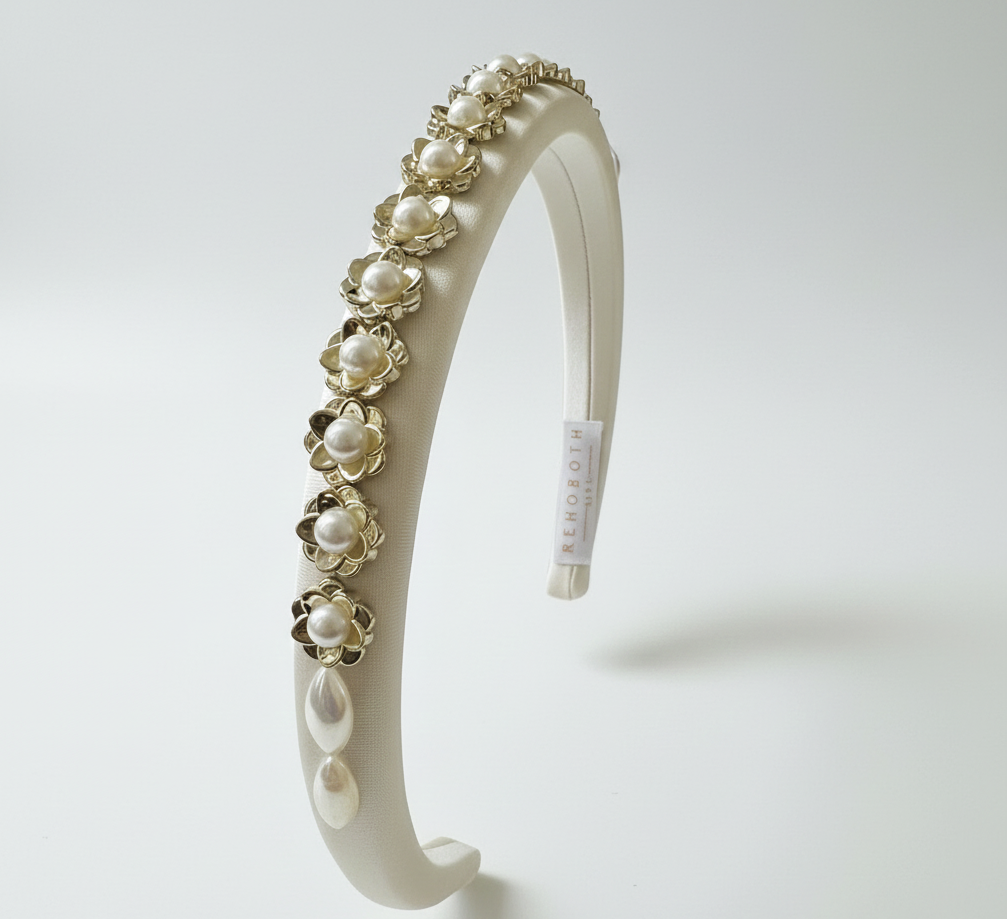 The Petite Pearl Trim Satin Headband is handcrafted in the UK using a smooth satin-wrapped base, finished with a continuous row of petite pearl florals along the crown.