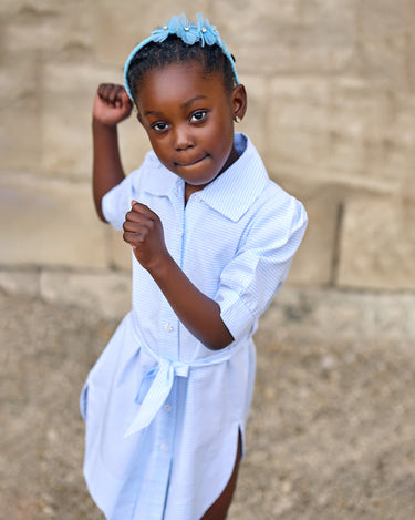 Timeless charm meets playful polish in the Celeste Striped Shirt Dress. With its classic collar, dainty daisy buttons, high low design and soft pastel blue pinstripes, this piece brings effortless elegance to everyday dressing. The self-tie belt adds a cinched, feminine silhouette that’s as versatile as it is chic.