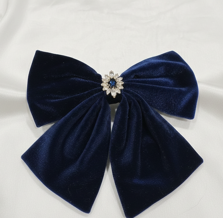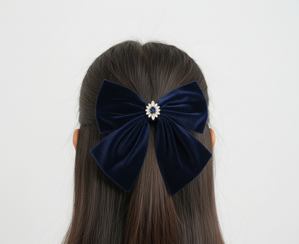 The Midnight Bloom Velvet Bow Clip is handcrafted in the UK using luxurious deep-navy velvet, shaped into a soft, cascading bow, and finished with a crystal floral centrepiece for a refined statement finish.